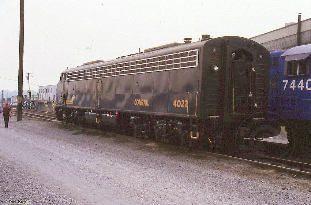 Conrail E8A 4022 is laying over at Enola Yard in 1986 during a tour. SW8 8673 is definitely not used to keeping this kind of company.