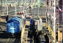 During the 44-day Septa strike in 1977, Conrail units lined up alongside the Amtrak GG1's, E60's, and E-8s at 30th Street. On Day 2 of the strike, CR 4022 E-8A rests beside an elder CR GG1 at the 30th Street Station engine service area.