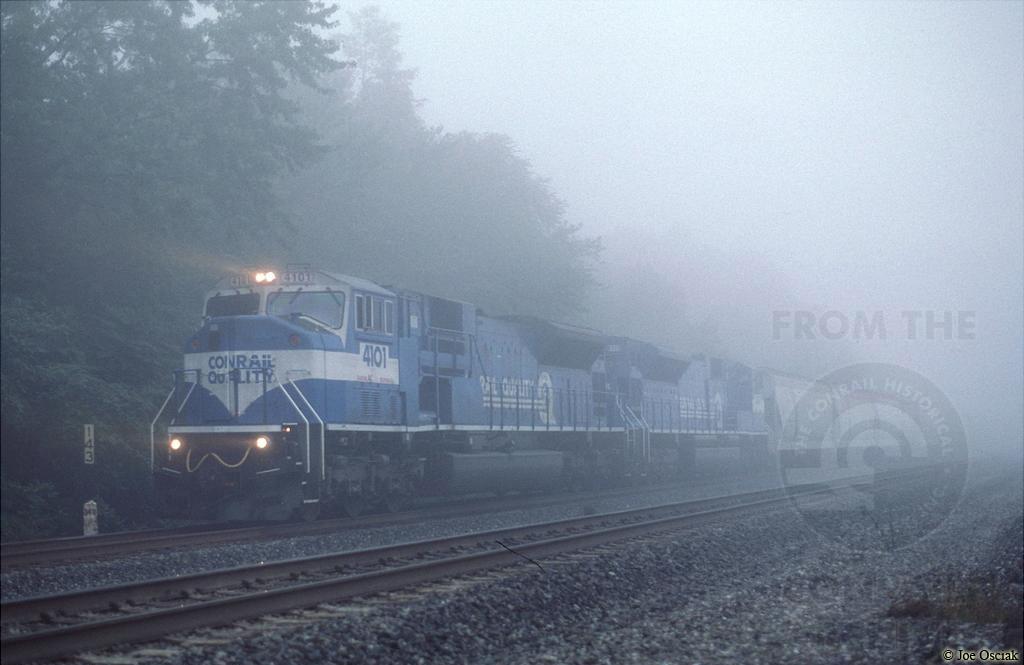 Conrail SD80MAC 4101 is seen blasting out of the mist at Thompsontown Station, PA with MOPI on 10/9/1997
