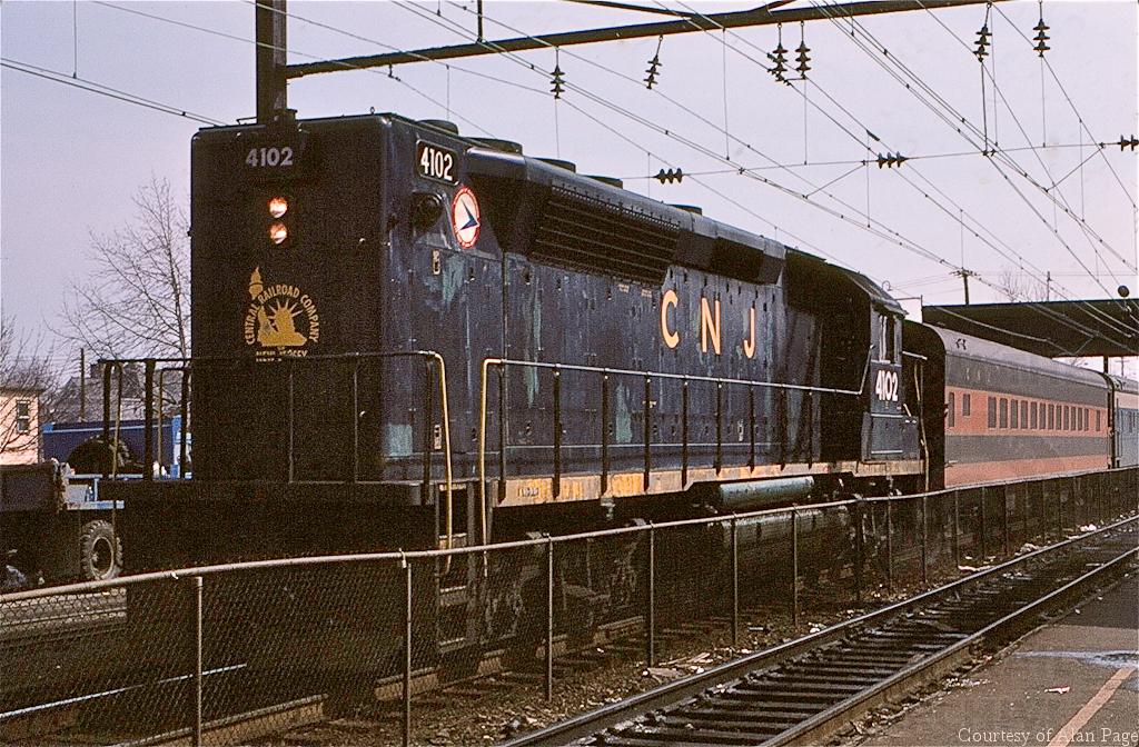 CR-operated NJDOT GP40P 4102 (ex-CNJ 3673) pulls ex-Great Northern coaches through South Amboy, NJ in March, 1978.