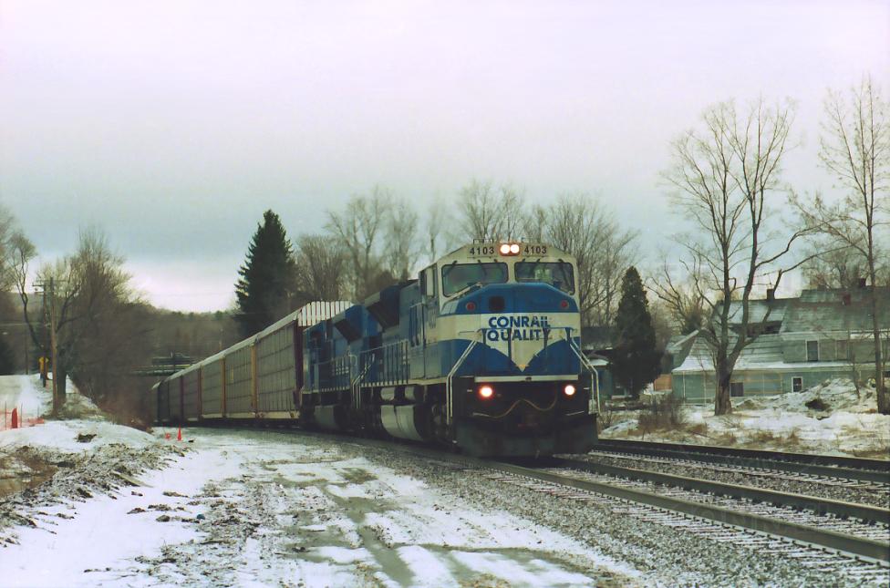 CR 4103 and mate reach the top of the grade at MP 142 in Hinsdale, MA. with SEBO on Feb. 21, 1998.