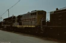 EL GP7 1241 (CR 5979) rests outside the Elizabethport locomotive shops with NJDOT GP40P 3675(ex-CNJ, CR roster 4104) and an SW-1 in July, 1977.