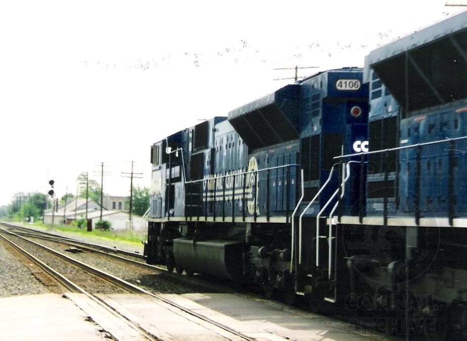 A trailing shot of Conrail SD80MAC 4106 on ELPI-5B at Waterloo, IN on May 25, 1996