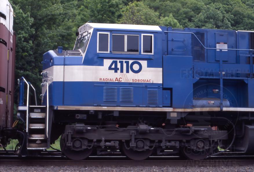 Side view of the cab of SD80MAC 4110 at Chester, MA. on June 7, 1997.