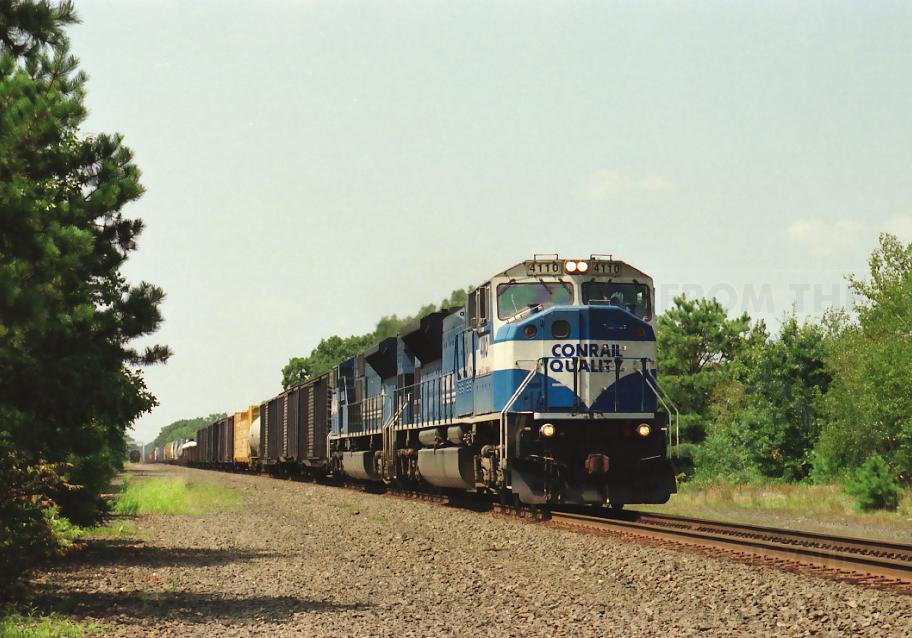 A recalcitrant (not loading) SD80MAC 4110 leads SEFR through North Wilbraham, MA. on Aug. 15, 1998. A chase of this guy as far as Warren showed the second unit to be holding it's own without too much fanfare.