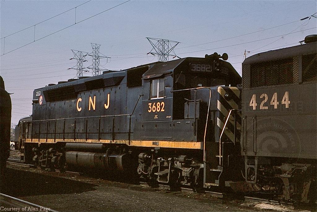At the South Amboy engine terminal, CNJ GP40P 3682 (CR roster 4111) readies E-7A 4244 to replace an incoming GG-1 for service out of South Amboy Station in March, 1978.