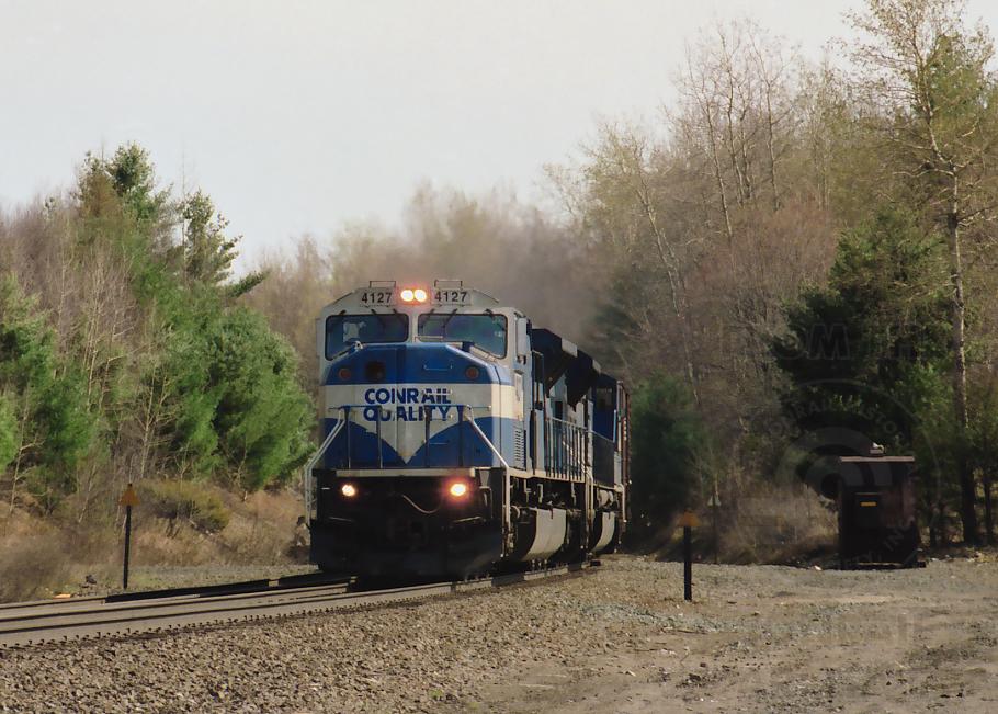 SD80MAC 4127 leads FRSE out of Washington cut and past the old depot site in Washington, MA. on April 18, 1998.