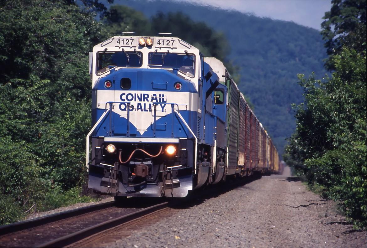 SD80MAC 4127 leads SEBO by MP 110 in Westfield, MA. on July 5, 1997. This is what is known as an "optical delusion". Although it looks like the train is coming upgrade toward the camera, according to the CR route characteristics chart, it is actually on the level and starting on a slight downgrade as he approaches CP 109.