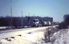 Conrail 4144 and 4142 pass the 332 signals east of Stryker, OH on January 7, 1999. Chris Howe photo