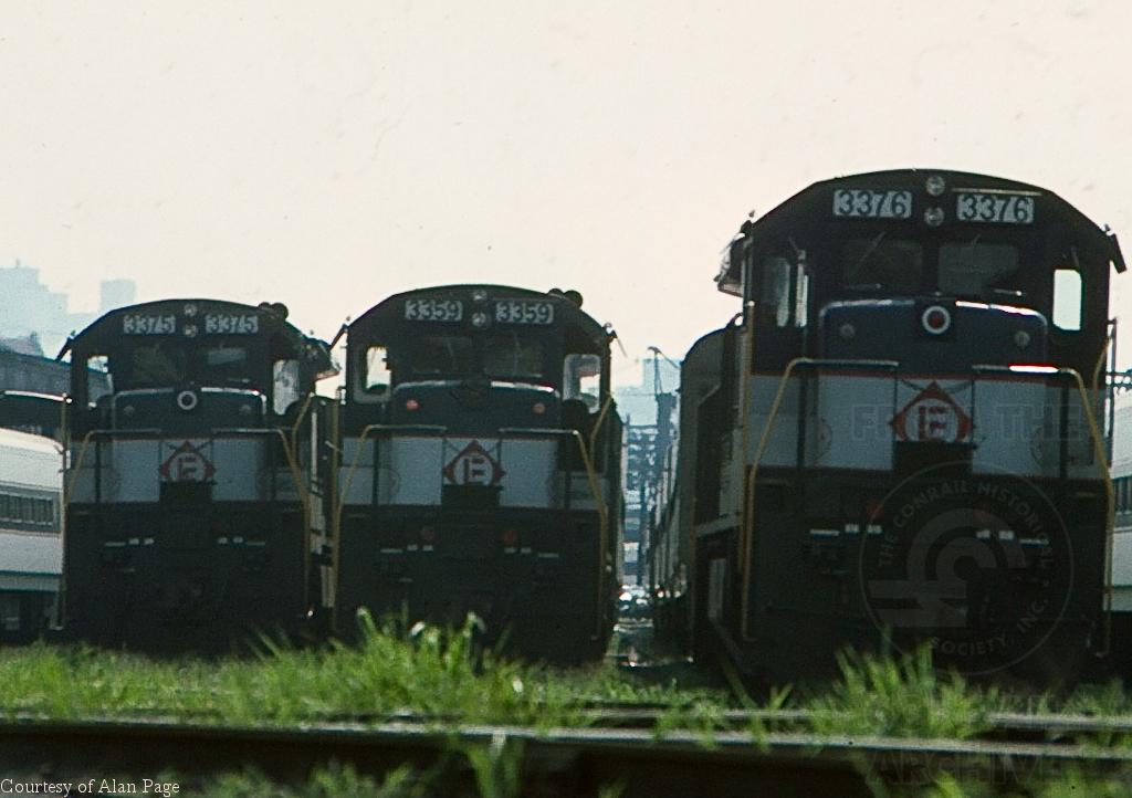 CR-operated former EL U34CH's 3376, 3359, and 3375 (CR roster 4176, 4159, and 4175, respectively) await assignment at the Hoboken engine terminal in August, 1977.