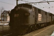 PC E-7A 4244 and ex-CNJ GP-40P 3682 prepare to couple on to a set of PRR Keystone-laden coaches at South Amboy station in March, 1978.