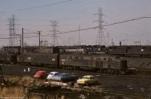 CR-operated ex-PC E-8A's 4328 and 4285, E-7A 4244, GP40P 3682 (CR roster 4111), and CR GP40 3190 are lined up in March, 1978, readying for NY&LB service at South Amboy station.