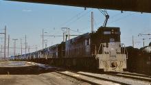 A sad August day at Morrisville in 1979 as E-44 4417 prepares to move west with a retirement train of E-33's and E-44's.