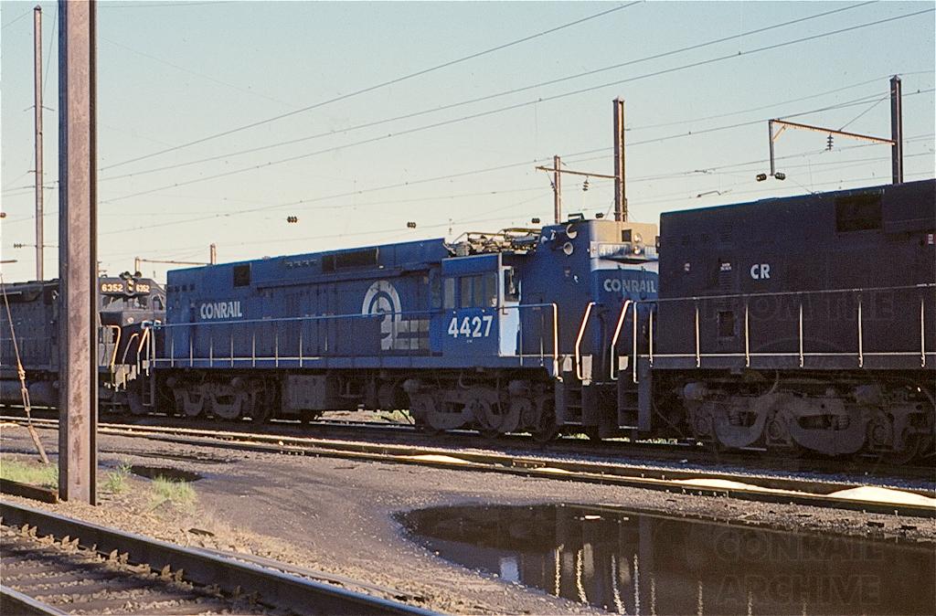 A sad August day at Morrisville in 1979 as E-44 4427 joins E-33's and other E-44's in a retirement train preparing to move west. A trio of E-44's led the train with SD45 6209 and SD40's 6352 and 6370 assisting.
