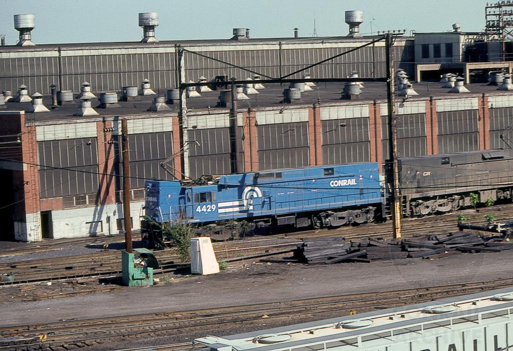 Outside the Enola locomotive shops, CR blue E-44 4429 teams up with sister E-44 4432 in May, 1979.