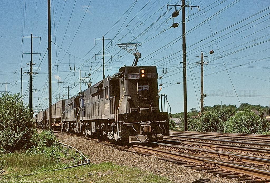 Leading a duo of E-44's through Morrisville, CR 4436 roars by with a TV train in June, 1979.