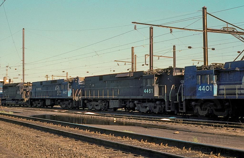 A sad August day at Morrisville in 1979 as E-44's 4461 and 4427 make up part of a retirement train preparing to move west.