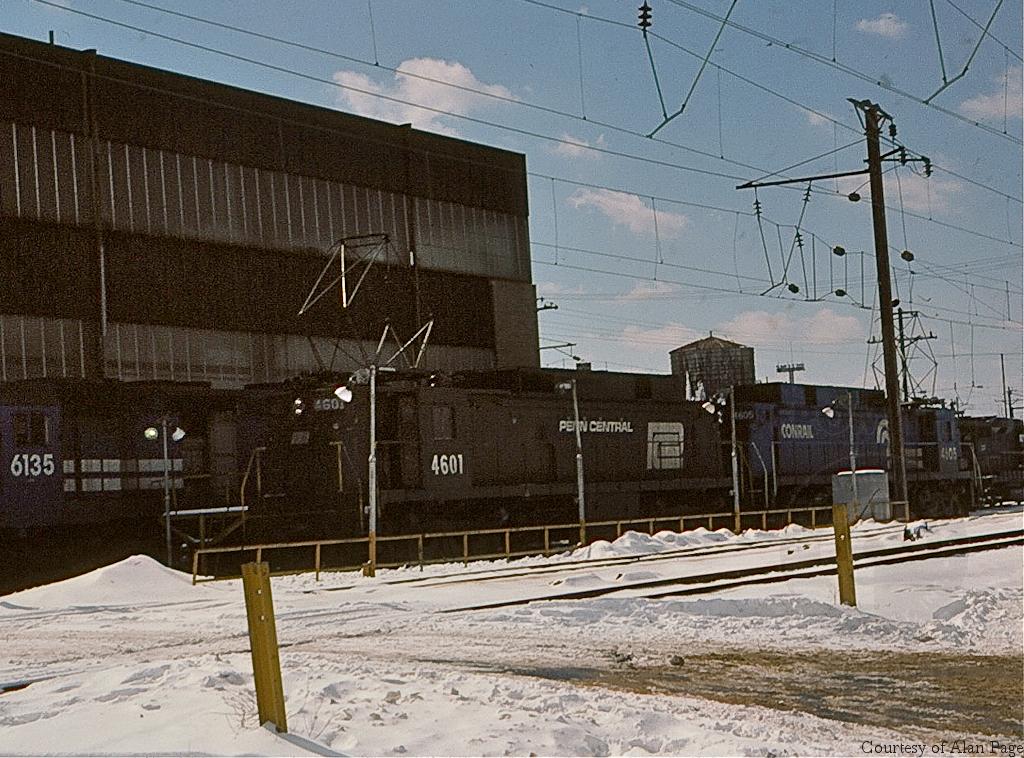 With SD45 6135 behind, former PC E-33's 4601 and 4605 wait for assignment outside the Morrisville shops on a snowy March, 1978.