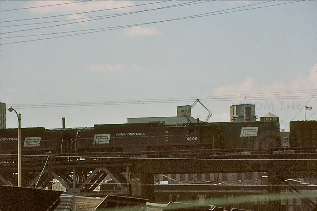 Still in their PC colors, E-33's 4606 and 4601 roll through on the high line at 30th Street Station in April, 1977.