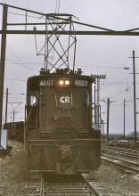 CR E-33 4607 pauses with sister-unit 4609 and a line of mixed freight at Morrisville yard in March, 1979.