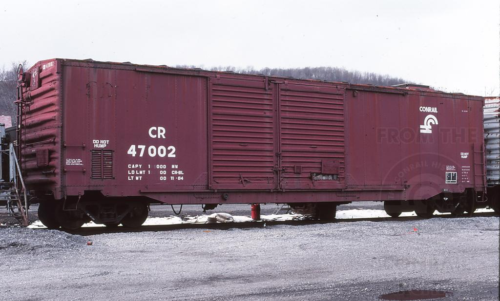 Previous Next CR 47002 is seen at Conemaugh, PA on 3/14/98. Car is ex EL 162308, 5-56 (although stenciled 1-61 on car) and painted CR-BL 11-84. Photo By Jeff Weaver Year 1998 Original Date 3/14/98 Conrail Number 47002 Collection CRHS Conrail Photo Archive Contributions