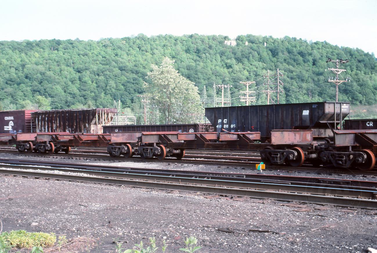 Only the frame and trucks remain on CR 472751 (former PRR 180796) as it awaits shop time to be utilized in the ongoing coalporter rebuild program. In July 1991 it would be released as CR 504446 class G52L coalporter.