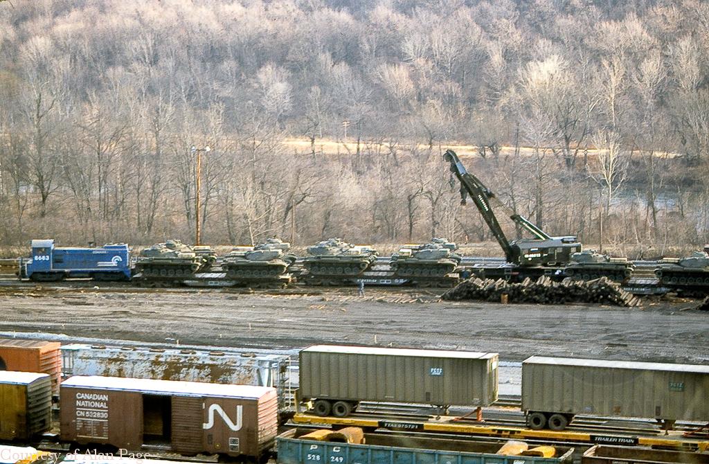 CR SW-8M 8683 (ex-LV 269) works a load of light tanks, along with support from the big hook of CR 48313, at Allentown yard in December, 1978.
