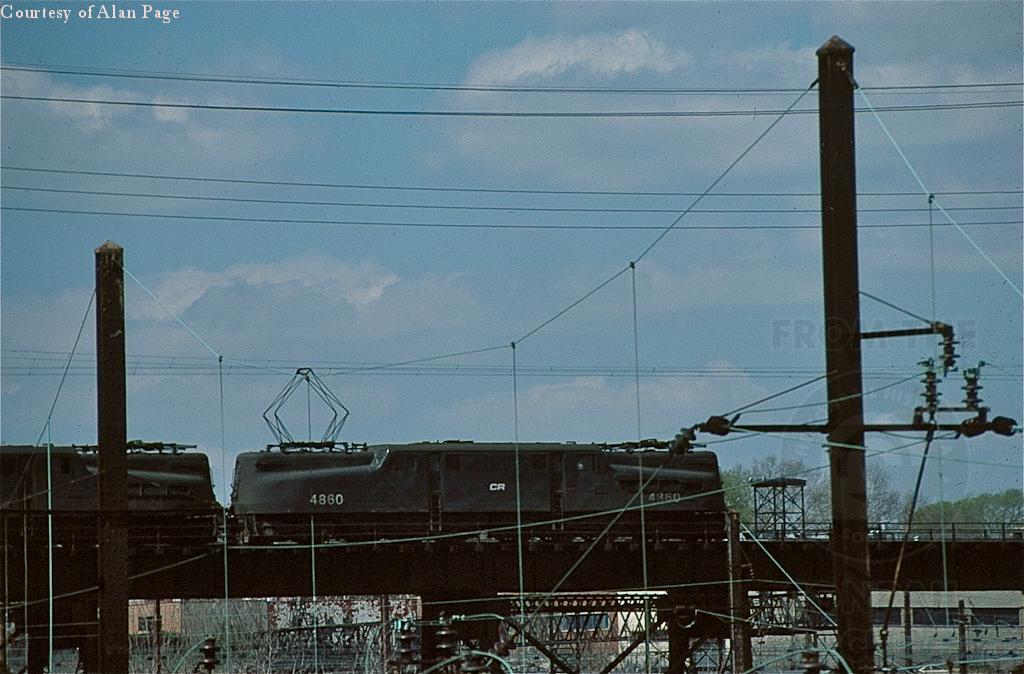 CR GG-1 works the "high line" at 30th Street Station, Philadelphia in April, 1977.