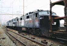 Conrail. GG-1 #4864 & #4852 & ex Penn Central EP-40 #4974 eastbound on track 3. New Brunswick, NJ. EP-40 going to Naporano scrapline near Newark, NJ. May 12, 1979.