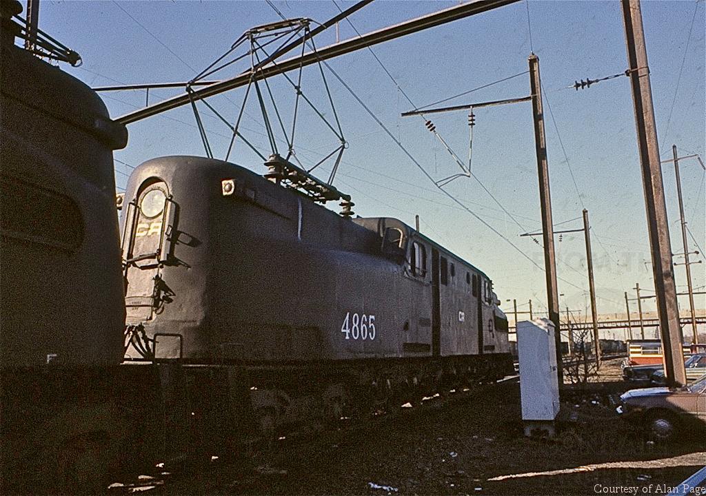 CR GG-1 4865 leads a tripleheader of G's pulling a mixed freight through Morrisville yard in February, 1979.