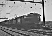 CR. Ex Penn Central GG-1 #4869 and friend with westbound freight New Brunswick, NJ on track 2 in August 16, 1976. The tri level cars with auto loads indicate that the train probably came from the Metuchen yard where a GM plant was located on Route 1. Photo taken with viewfinder 35mm camera using Kodak Pan-X black & white film