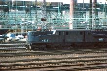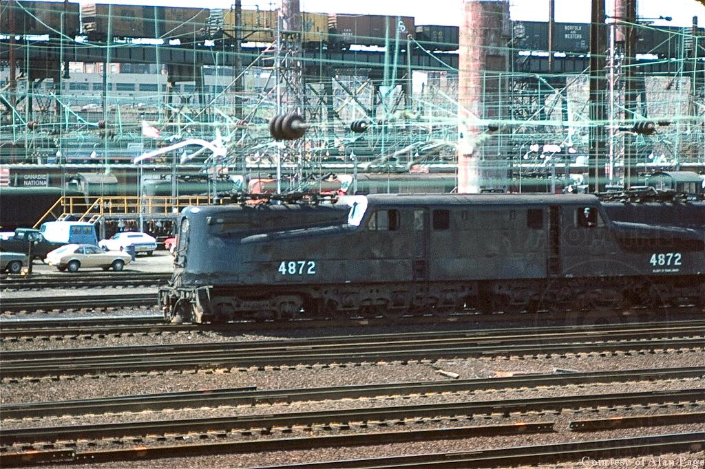 With a mixed freight pulled by boxcab electrics on the highline above, and ex-PC SW9 9140 on the engine service tracks behind, GG-1 4872 pulls commuters into 30th Streeet Station in Philadelphia, PA.