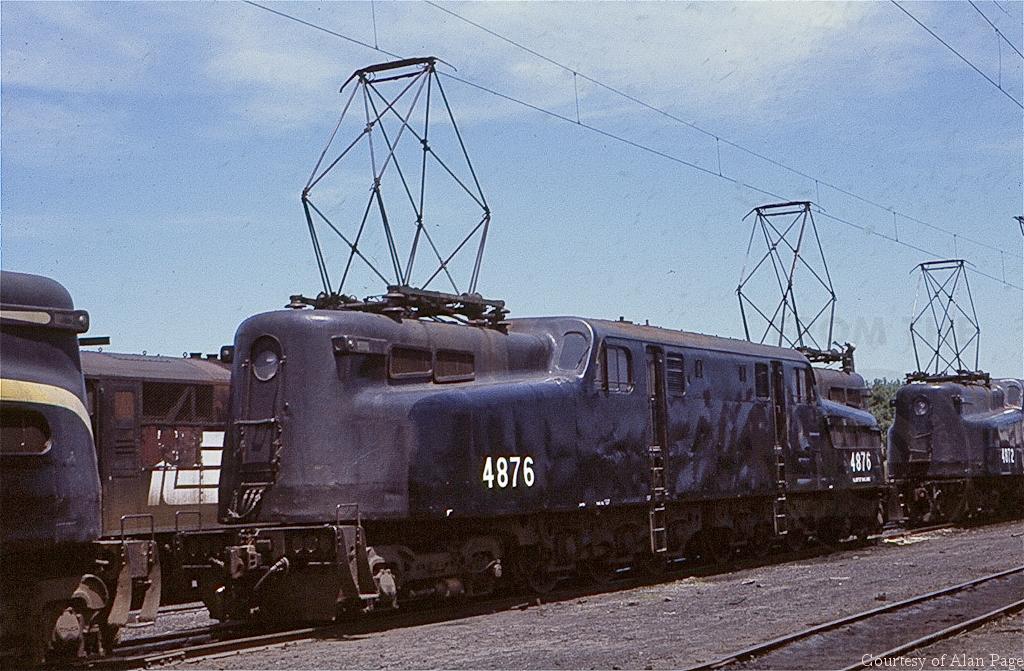 CR-operated NJDOT GG-1 4876 rests with both pans up between sister units at the South Amboy engine terminal. After retirement from NJDOT in 1983, the GG-1 was donated to NRHS Washington, DC chapter.
