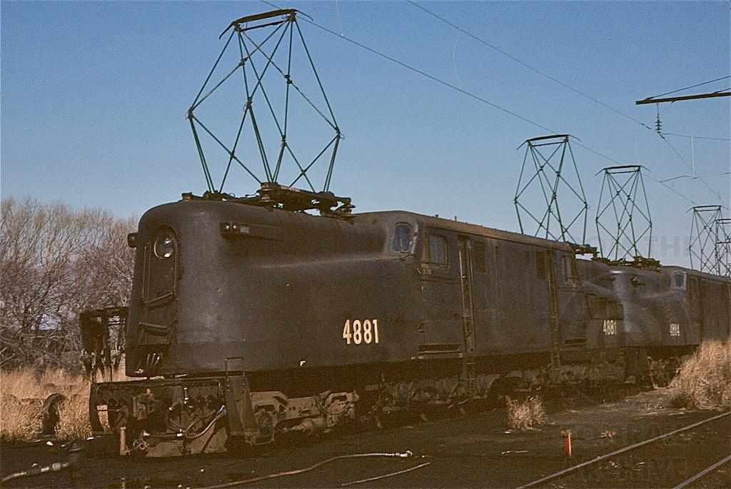 CR GG-1 4881 with a line of sister G's at South Amboy, NJ in March, 1982. The ageless electric enjoyed another year of operations under contract to NJ Transit until final retirement in July, 1983.
