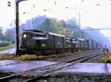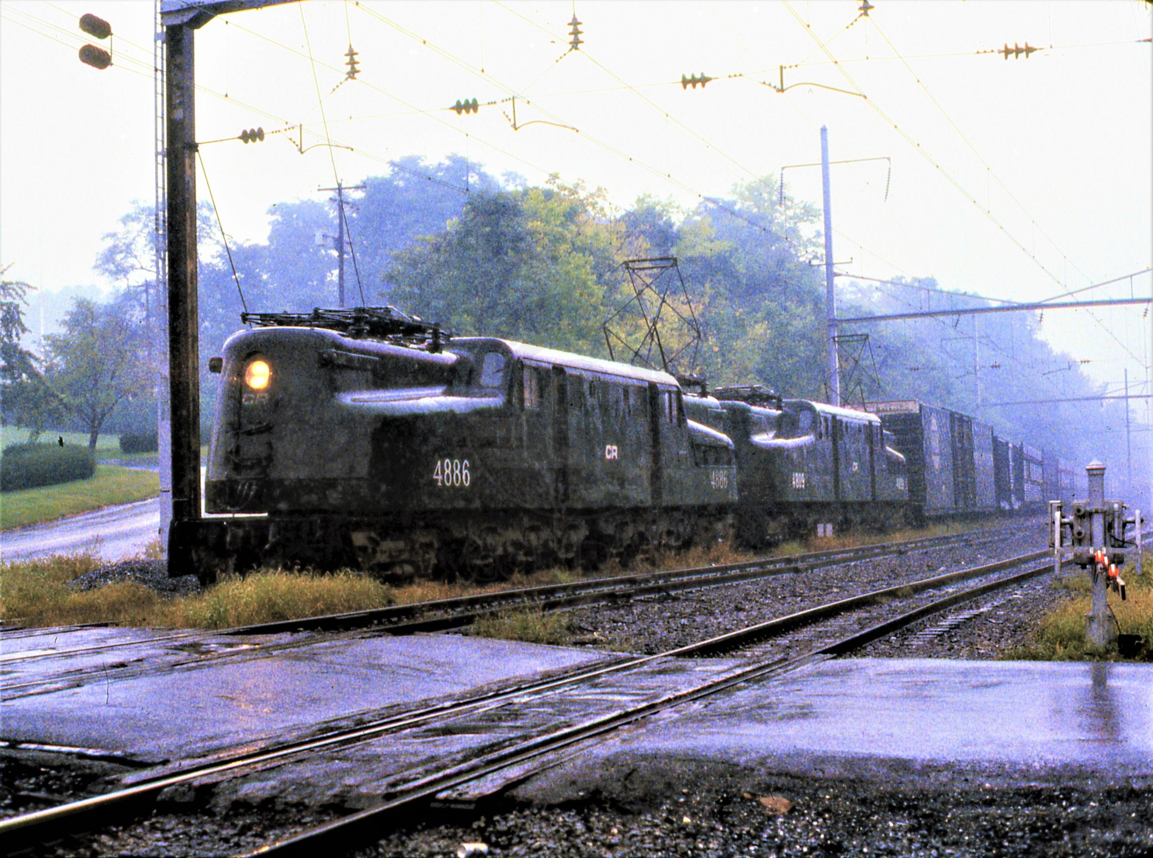 Conrail. GG-1 #4886 & #4809 on a very rainy day at West Fairview, PA. East end of Enola, PA. Sept. 16 1979