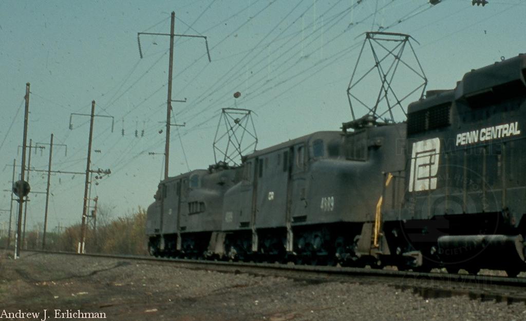 A pair of CR GG-1s (4889 is second) leads PC GP-30 2239 on a fast freight through Willow Grove, PA in April, 1977.