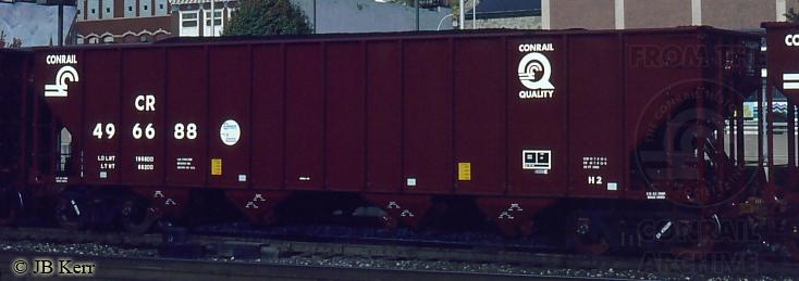 Conrail class H2 hopper 496688 is seen in Altoona, PA in October, 1994. Taken on her first trip west after being built at the Sam Rea Shops in Hollidaysburg, PA