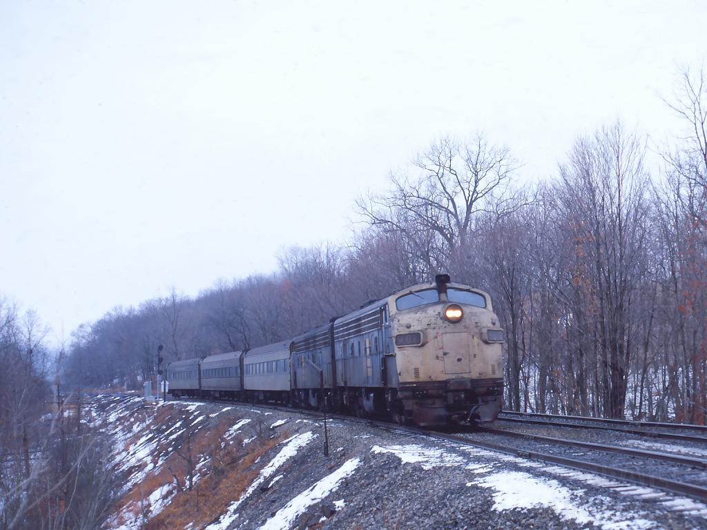 A disheveled CR 5003 leads a northbound commuter train by Nelson Blvd. near Brewster, NY. on Dec. 29, 1980. If you look closely, you can see some of the red New Haven paint showing through on the nose. Since it's difficult to read, I believe the second unit is the 5055.