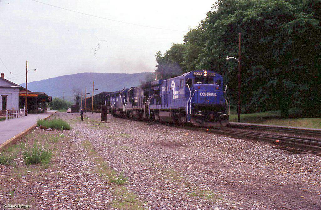 Conrail B36-7 5003 is seen leading a westbound auto parts train at Lewistown, PA in 1992.