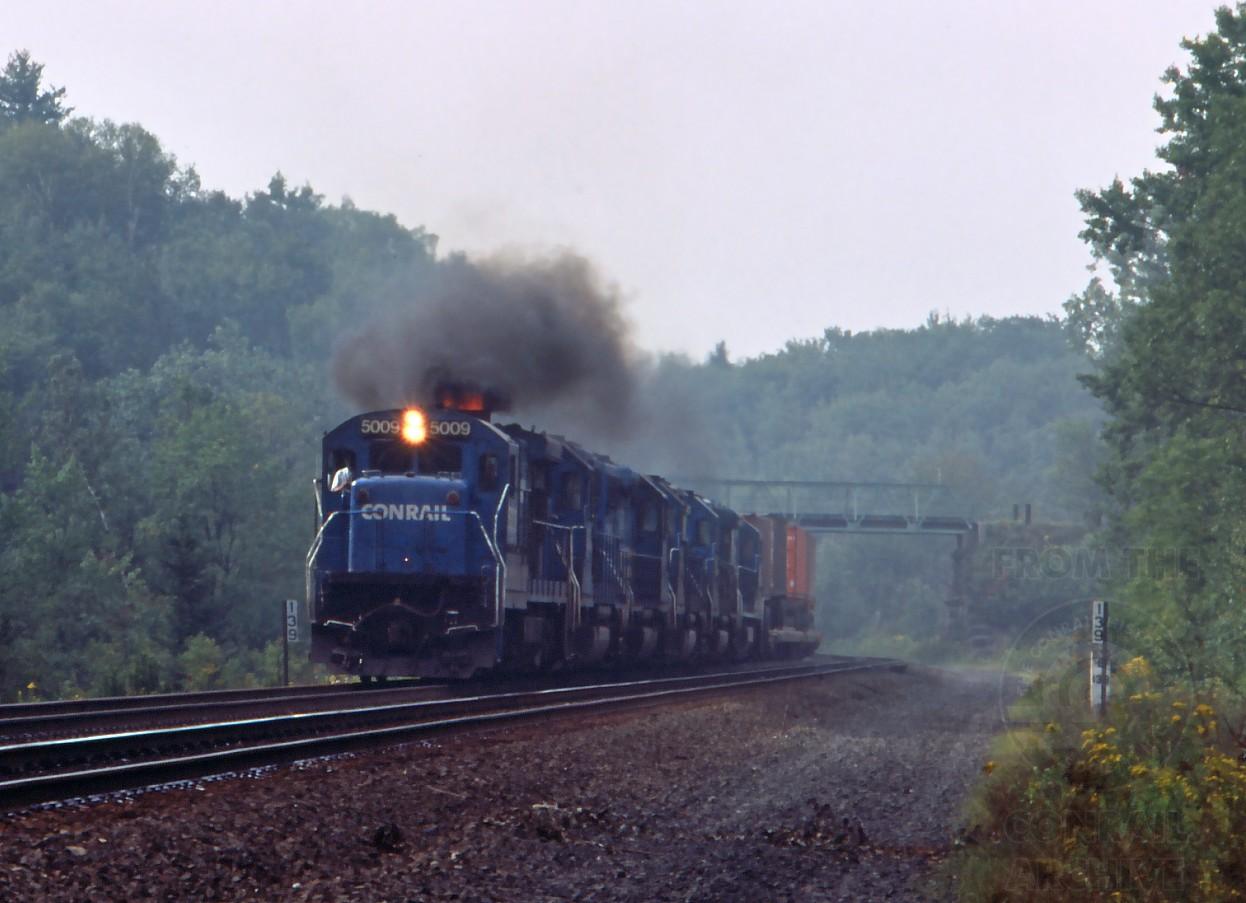 What you often get when you "wipe the throttle" on a GE. B36-7 5009 has a little "heartburn" with TV-9 at MP 139 in Hinsdale, MA. on Sept.3, 1993.