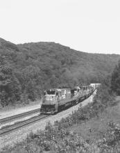 BOSE continues past MP 129 in Becket, MA. on July 25, 1992. ConRail, like it's predecessors, had a proclivity for using the B&A as a testing ground for new power. The New York Central borrowed a set of German built Krauss-Maffei diesel hydraulics from the Rio Grande back in the '50's to test on this route. The combination of tonnage, grades, and curvature proved to be more than the, relatively, delicate diesel hydraulic drive could handle. And, of course, in 1926 the world's first 2-8-4 steam loco, Lima's "Super Power" A-1 would be named after these hills in western Massachusetts. The Boston & Albany would acquire 60 of them and adopt Lima's designation as their class....A1a, A1b, and A1c.