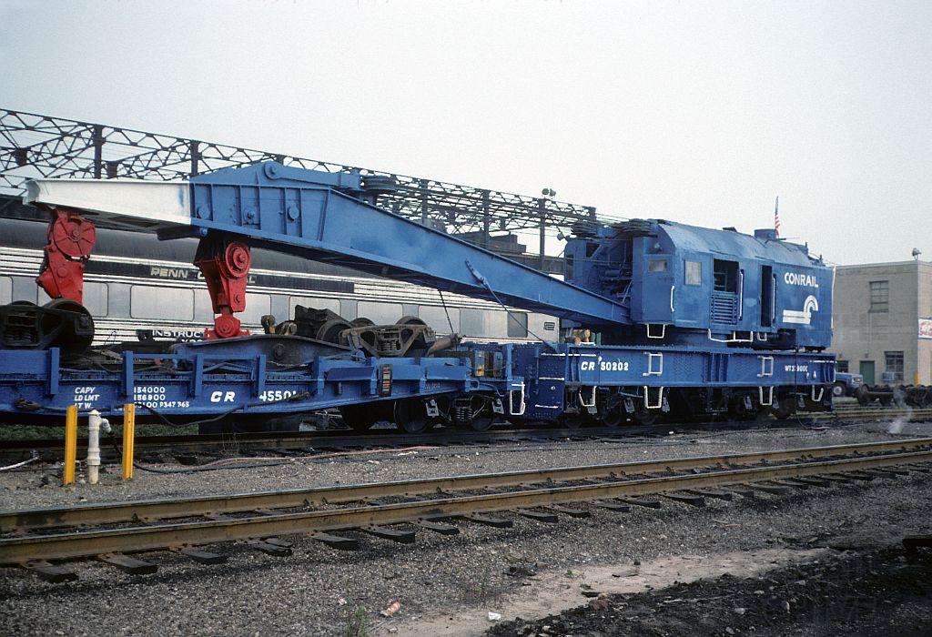 Close up view of CR crane 50202 after being painted at Conway. Boom flat 45501 is also now blue and sporting non-standard lettering. Al Mixter photo August 25th, 1976.