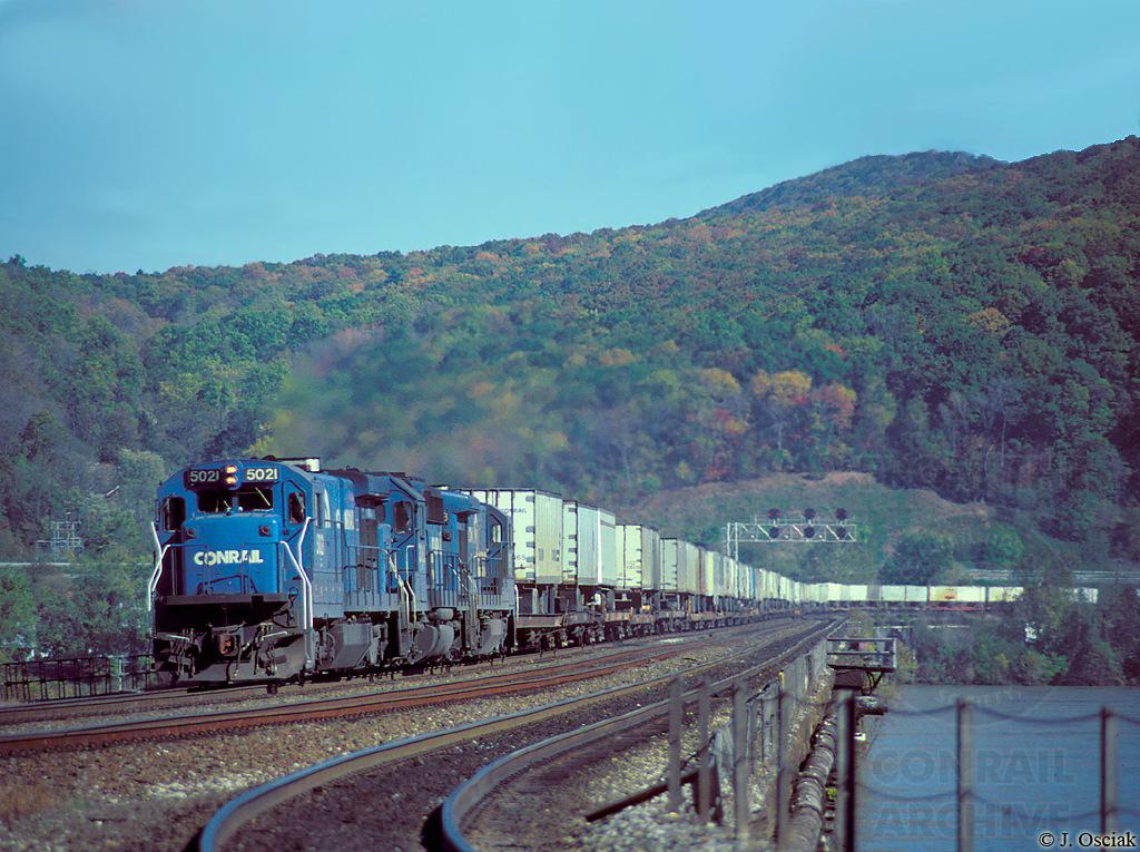 Conrail B36-7 5021 is seen leading a long Mail9H at Rockville Bridge on 10/20/1990
