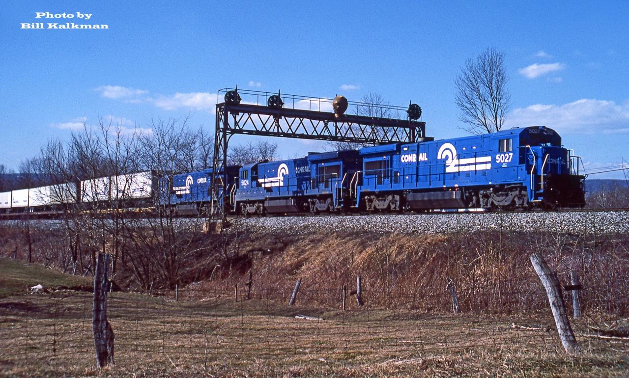 A trio of CR B36-7s, 5027, 5024 & 5054, are on the point of an E/B TOFC train, symbol unknown. Its on track one of the Pittsburgh Line. The signal bridge is long gone. 2:04PM on 3-9-85 in Horningford, PA.