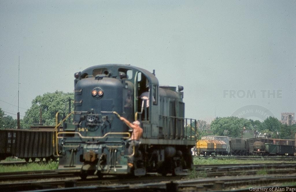 The crewman of former CNJ RS-3 1543 (CR 5373) hangs on as they work the yard at Elizabethport, NJ on a hot July day in 1977.