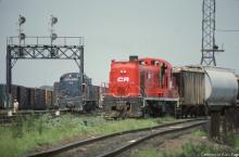 Former CNJ RS-3's 1552 (CR 5381) and 1543 (CR 5373) work the yard at Elizabethport, NJ in July, 1977.