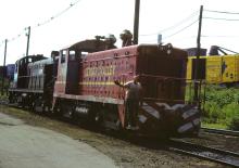 A veteran crewman guides former LV SW9 281 (CR 8932) and RS-3 5389 (ex-CNJ 1564) behind the Elizabethport shops in July, 1977.