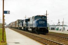 Conrail SD60M 5505 is seen leading an eastbound stack train past the Amtrak station at Depew, NY. Notice how some of the waiting passengers are sitting in the right-of-way...these people would probably sue Amtrak for not providing enough benches, and Conrail for having the nerve to operate a train on that track had they been struck by something...