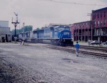 A pair of SD's and a C40-8W lead a 109 car UNG train past the semaphore at Waverly as it makes its way to NYSEG's Goudy Station in Johnson City.