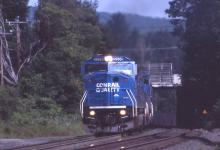 SD60M 5536 leads a UBO Bow coal train over the crest of the grade at MP 142 in Hinsdale, MA. on July 16, 1994. These coal trains swapped back and forth between ConRail and B&M routings. The ConRail route went to Worcester, then up the old B&M Worcester main to Ayer, then a short stretch via the Fitchburg main to the Stony Brook branch at the Willows to North Chelmsford and north on the old New Hampshire main to Bow, NH. just south of Concord.